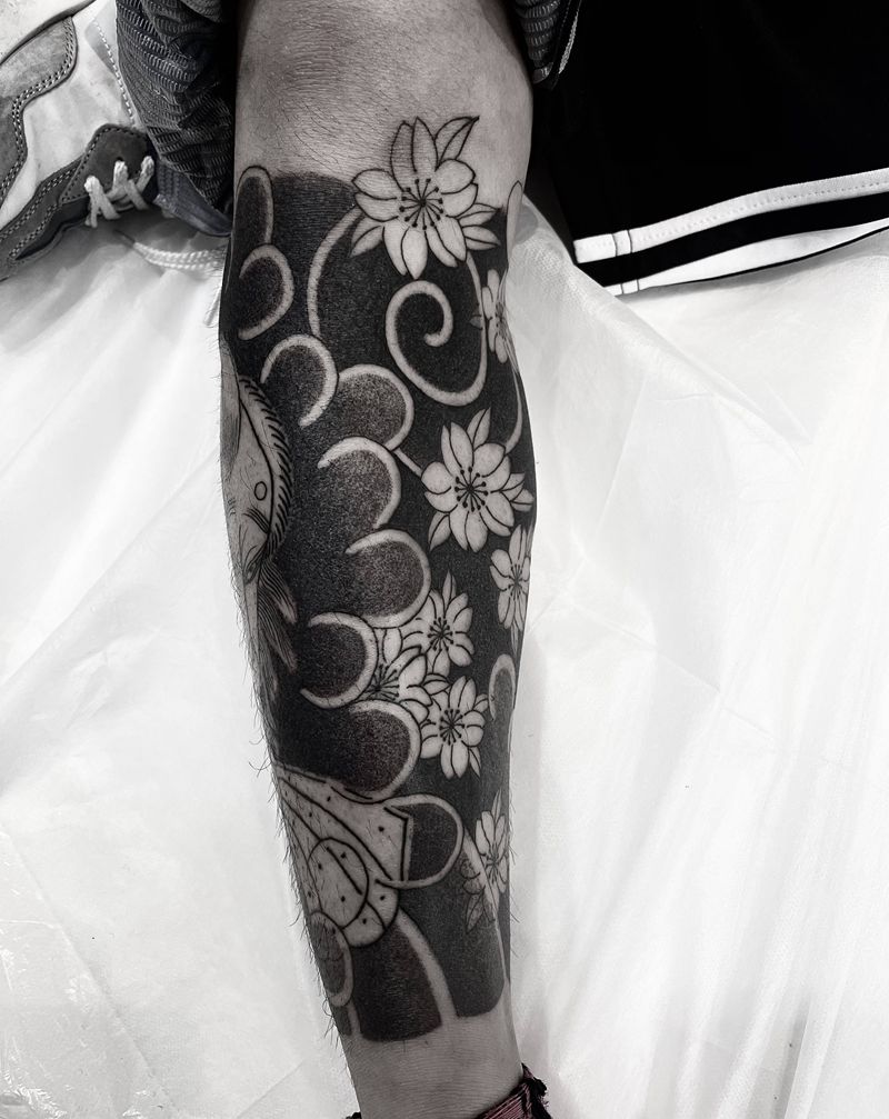 老传统樱花包小腿纹身图片_腿部老传统纹身图案