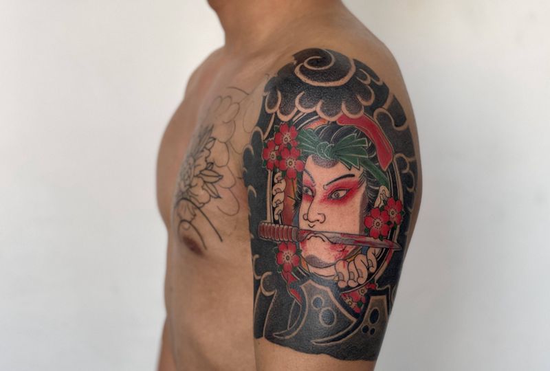 当前位置: 首页 >江苏省徐州市纹身店-也花刺青纹身图案>半甲纹身图片_胸部手臂新传统纹身图案