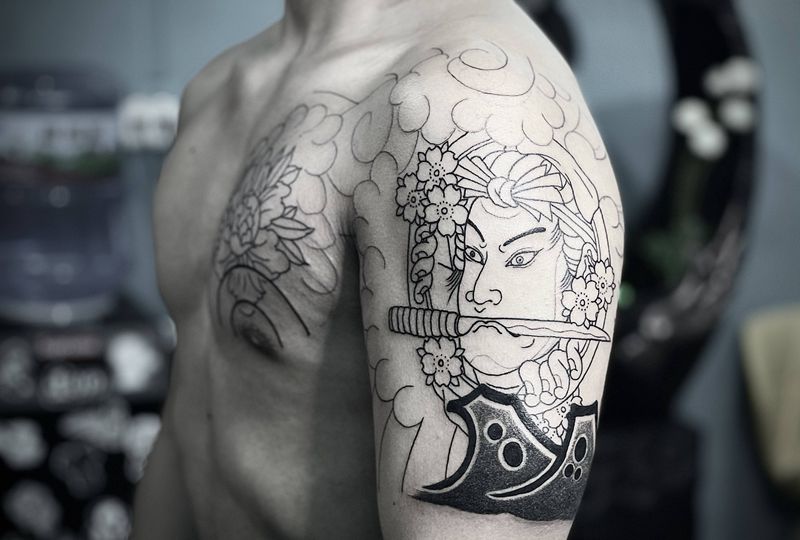 当前位置: 首页 >江苏省徐州市纹身店-也花刺青纹身图案>半甲纹身图片_手臂胸部老传统牡丹生首纹身图案