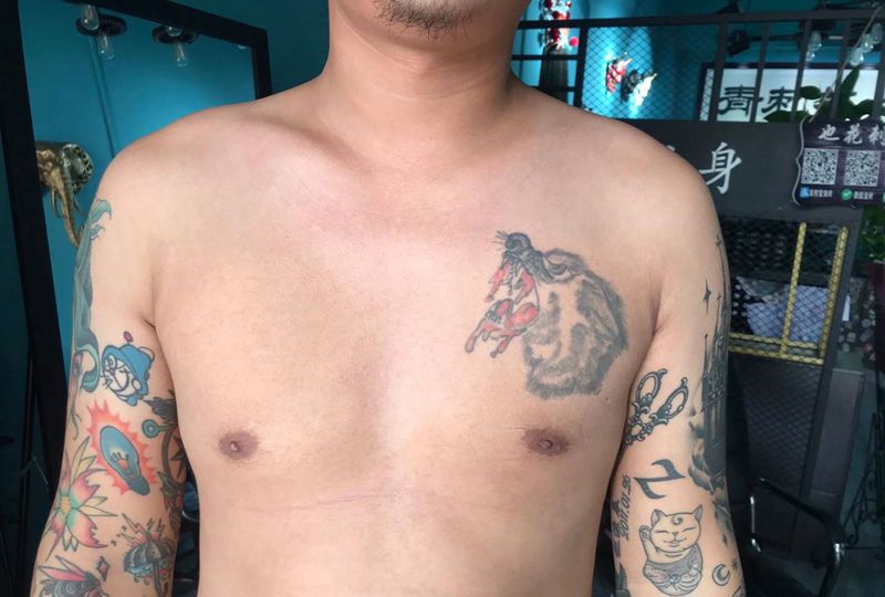 当前位置: 首页 >江苏省徐州市纹身店-也花刺青纹身图案>福狮花胸纹身图片_胸部新传统唐狮纹身图案