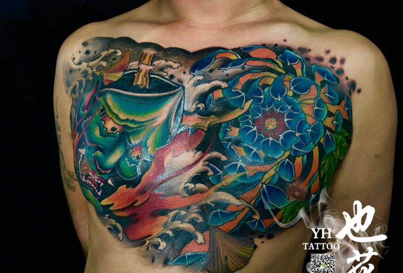 当前位置: 首页 >江苏省徐州市纹身店-也花刺青纹身图案>遮盖纹身图片_颈部胸部新传统般若 菊花纹身图案