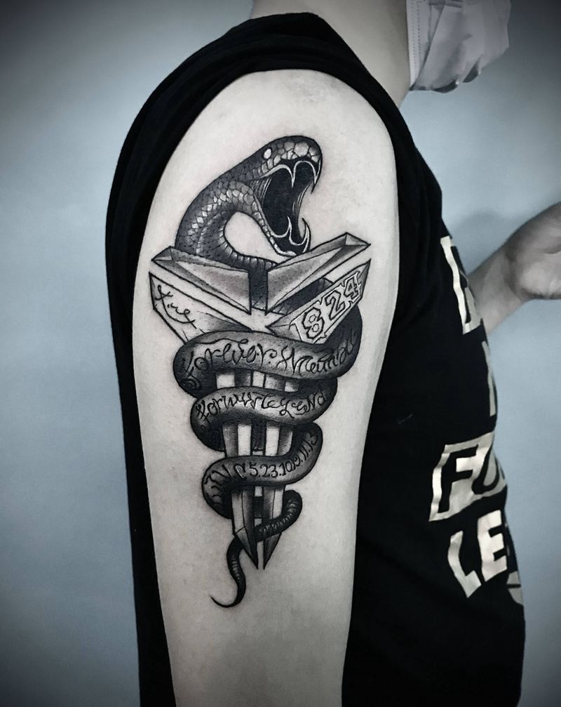 黑曼巴纹身图片_手臂肩部几何花体字纹身图案