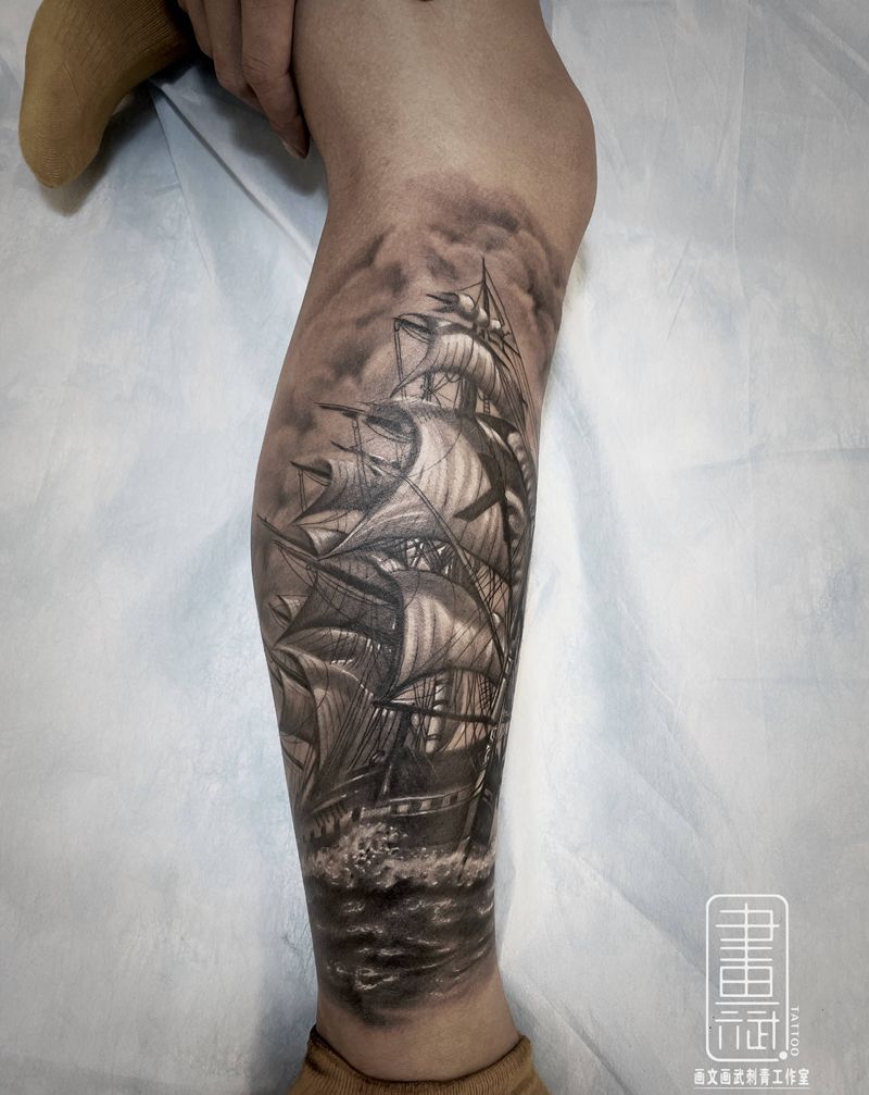 当前位置: 首页 >江苏省徐州市纹身店-徐州画文画武刺青工作室纹身图案>一帆风顺纹身图片_腿部欧美写实帆船遮盖船纹身图案