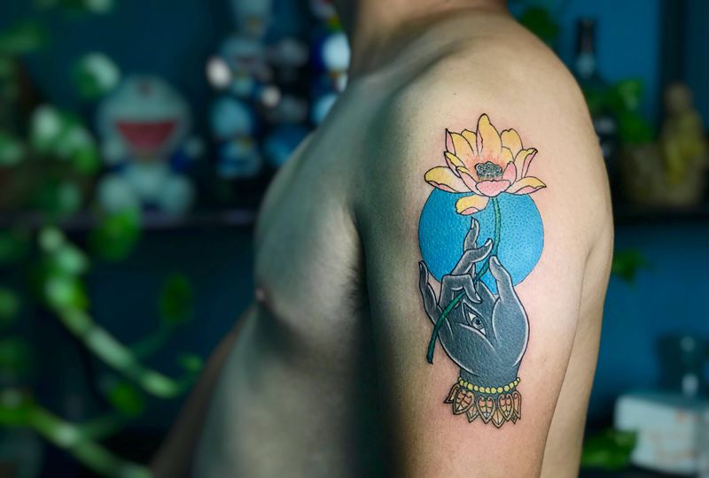 当前位置: 首页 >江苏省徐州市纹身店-也花刺青纹身图案>佛手莲纹身图片_手臂新传统佛手莲花纹身图案