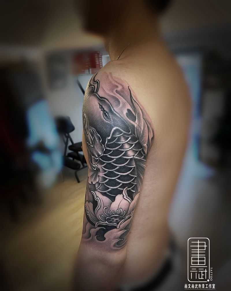 富贵有鱼纹身图片_手臂新传统鱼荷花锦鲤纹身图案