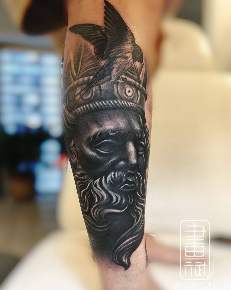 遮盖纹身图片_腿部欧美写实波塞冬八一纪念碑遮盖纹身图案
