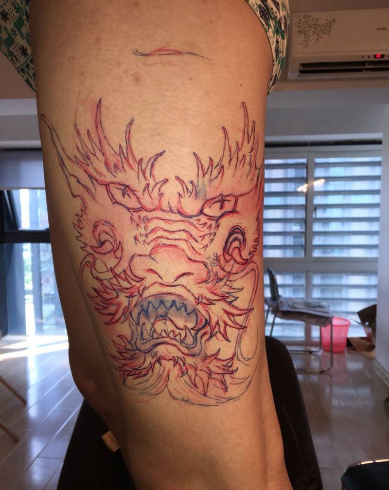 • T网红王老大花腿龙纹身图片_腿部新传统纹身图案
