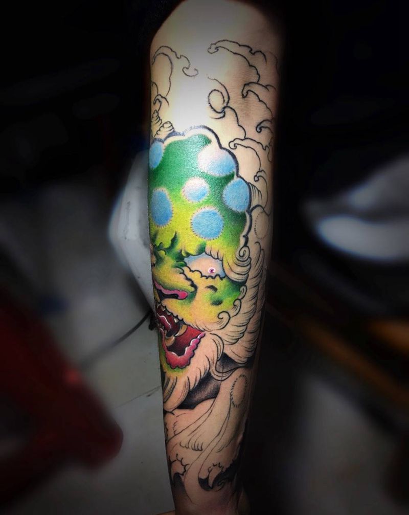 当前位置: 首页 >江苏省徐州市纹身店-徐州画文画武刺青工作室纹身图案>唐狮纹身图片