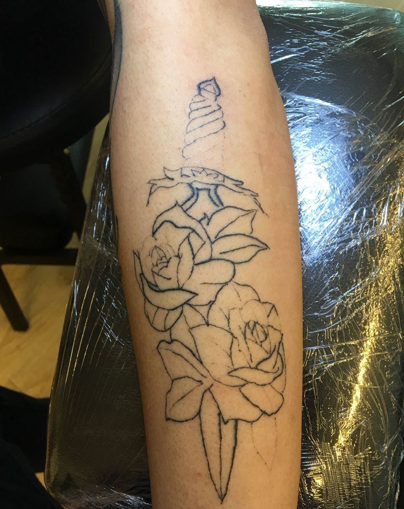玫瑰 剑纹身图片_手臂点刺玫瑰 剑纹身图案