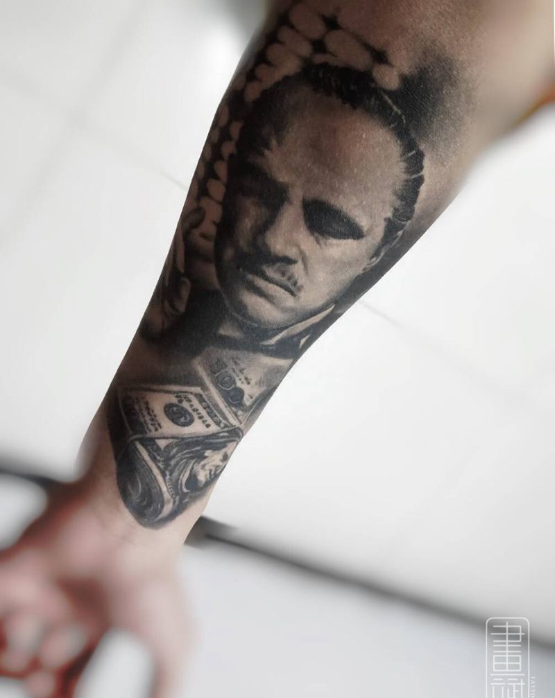 当前位置: 首页 >江苏省徐州市纹身店-徐州画文画武刺青工作室纹身图案>教父纹身图片_手臂欧美写实教父老爷车美元纹身图案