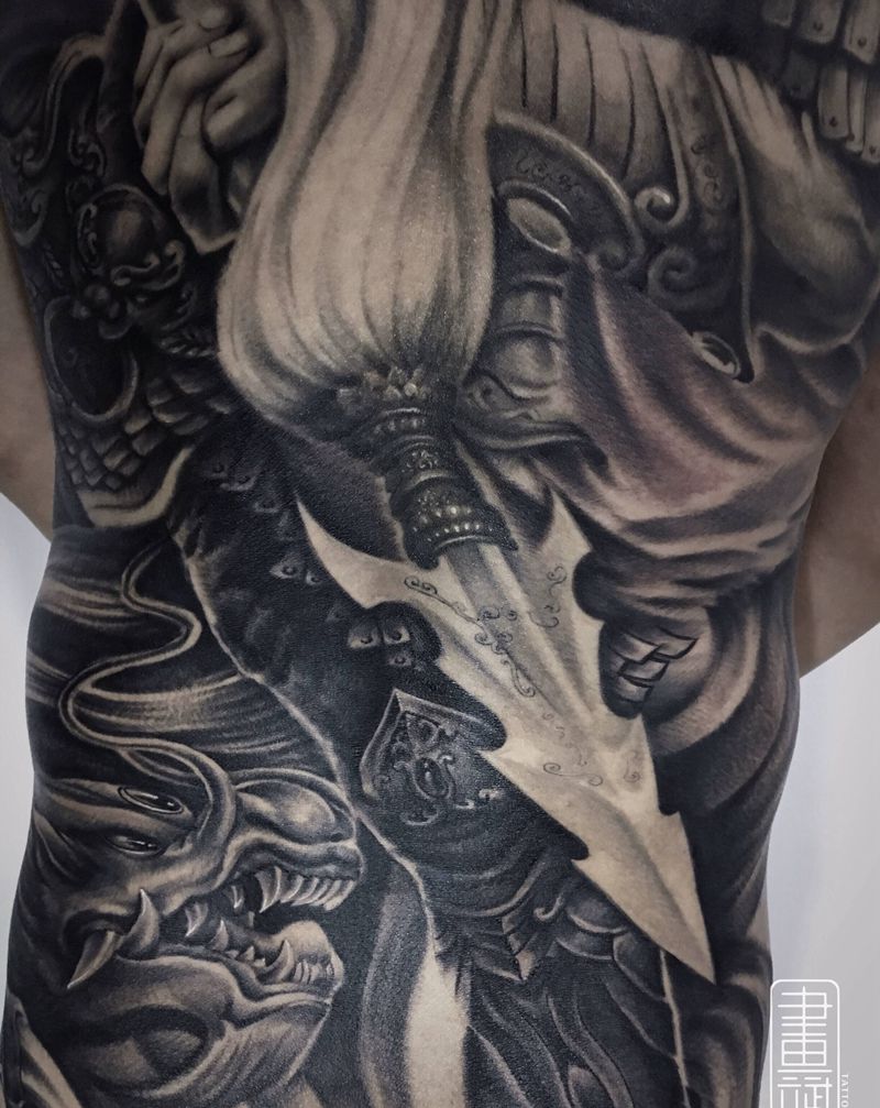 赵子龙纹身图片_背部欧美写实赵云龙临赵子龙纹身图案