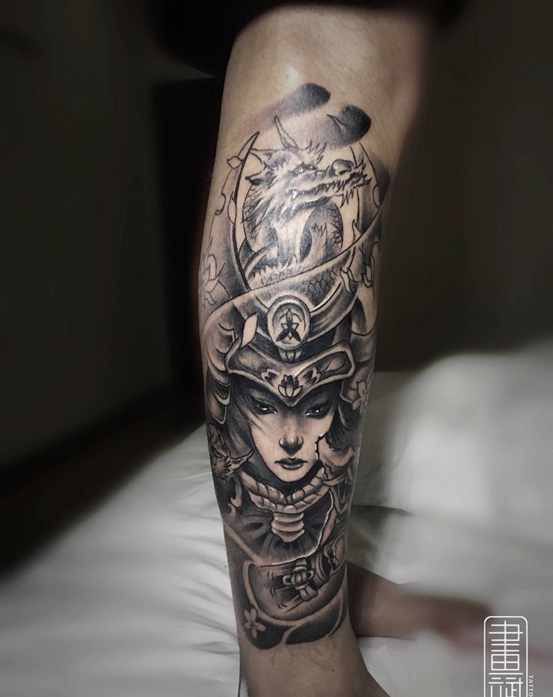 女武士纹身图片_腿部新传统女武士龙武士小腿纹身图案