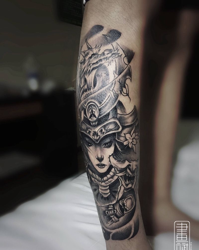 女武士纹身图片_腿部新传统女武士龙武士小腿纹身图案