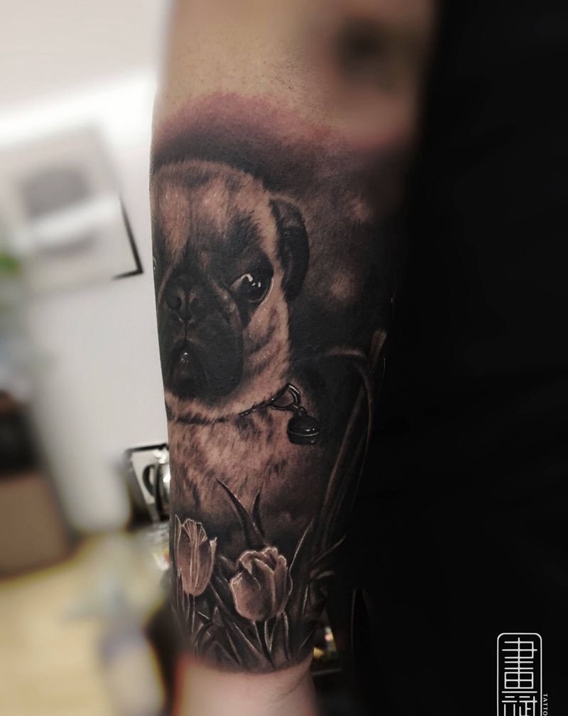 当前位置: 首页 >江苏省徐州市纹身店-徐州画文画武刺青工作室纹身图案>肖像纹身图片_手臂欧美写实巴哥犬肖像花朵纹身图案