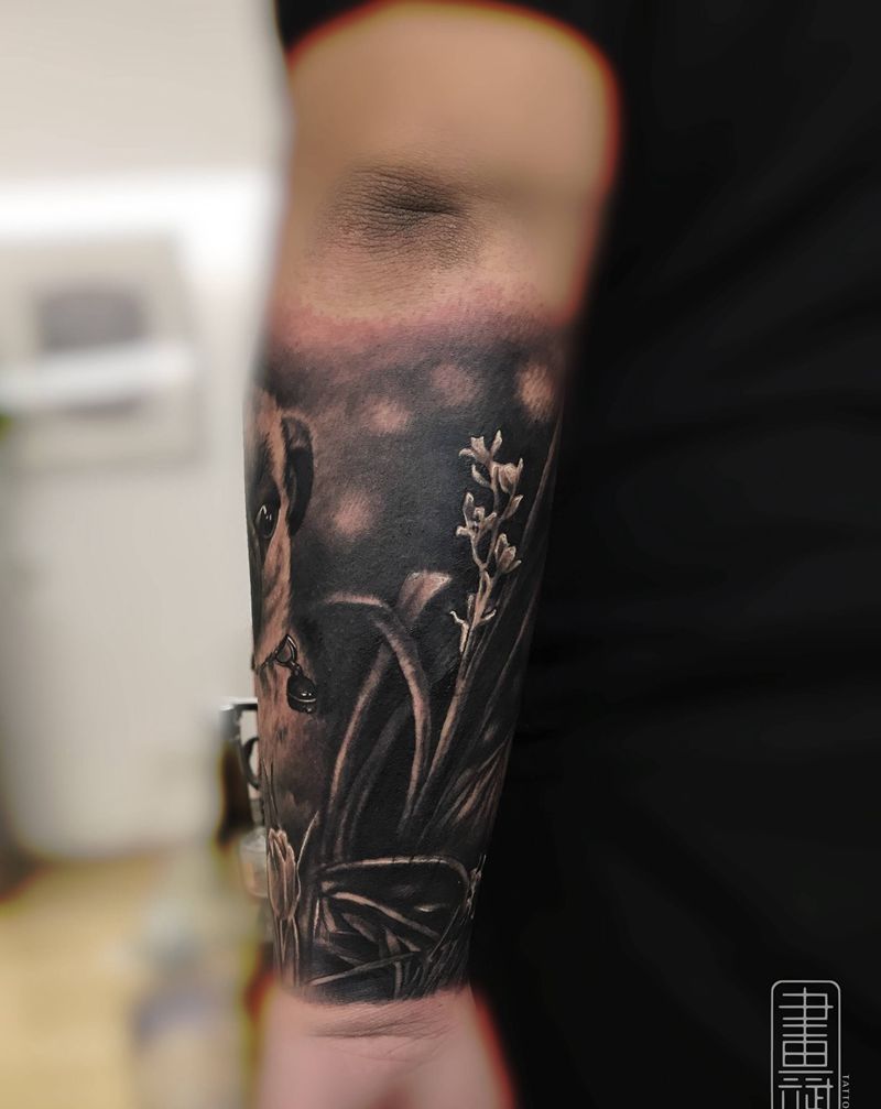 当前位置: 首页 >江苏省徐州市纹身店-徐州画文画武刺青工作室纹身图案>肖像纹身图片_手臂欧美写实巴哥犬肖像花朵纹身图案