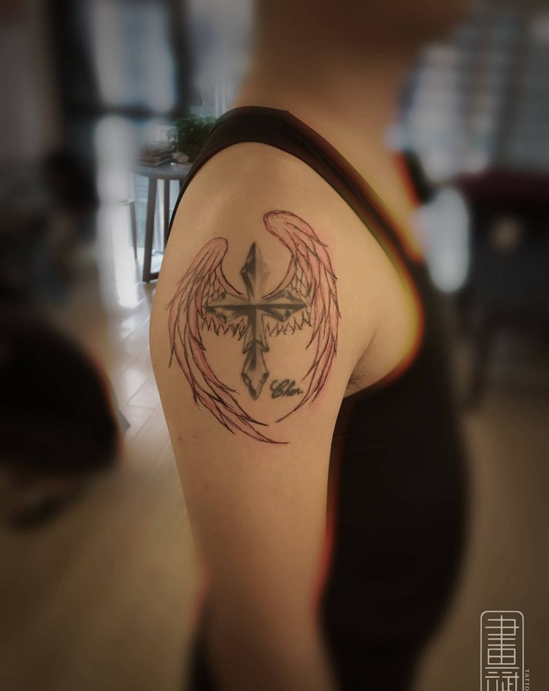 当前位置: 首页 >江苏省徐州市纹身店-徐州画文画武刺青工作室纹身图案>修改纹身图片_手臂欧美写实十字架修改十字架翅膀纹身图案