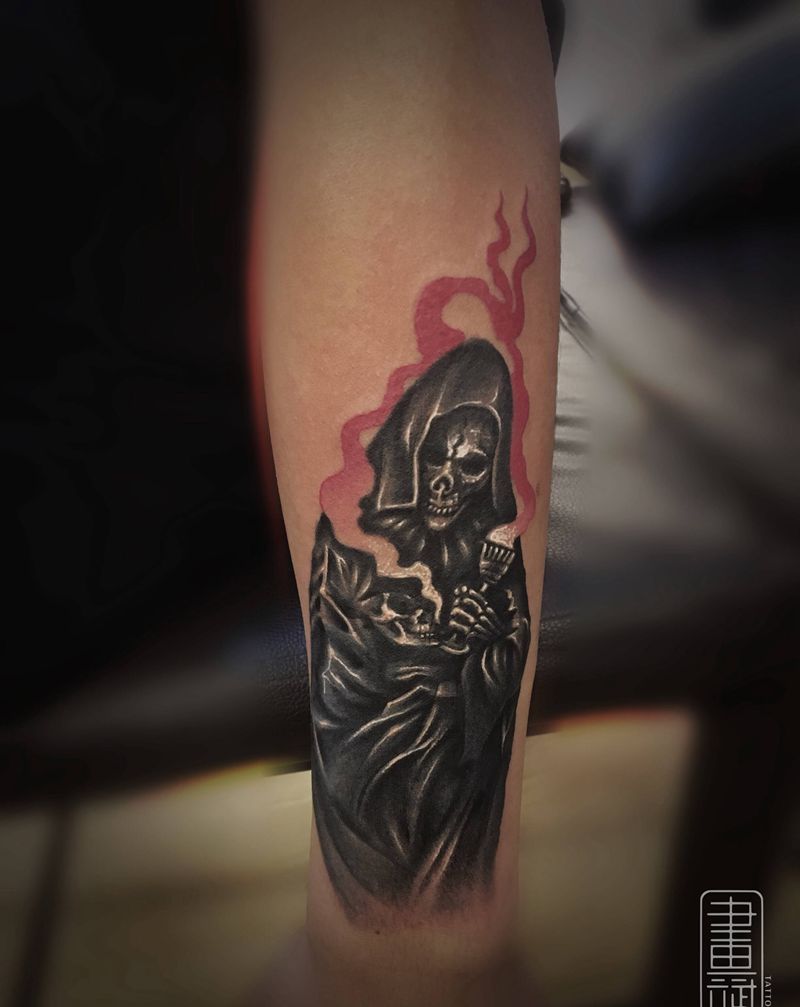 当前位置: 首页 >江苏省徐州市纹身店-徐州画文画武刺青工作室纹身图案>遮盖纹身图片_手臂欧美写实遮盖暴力遮盖死神纹身图案