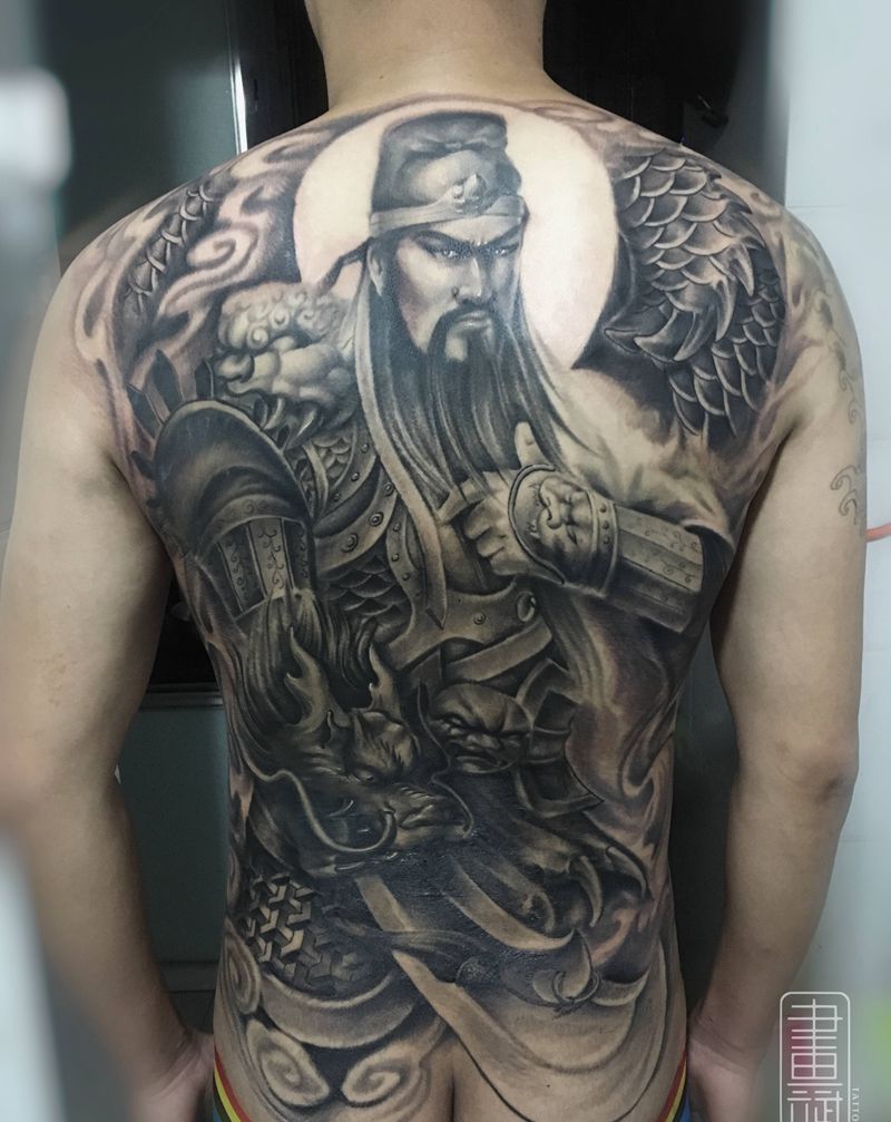 关云长纹身图片_背部欧美写实关公关羽关云长纹身图案