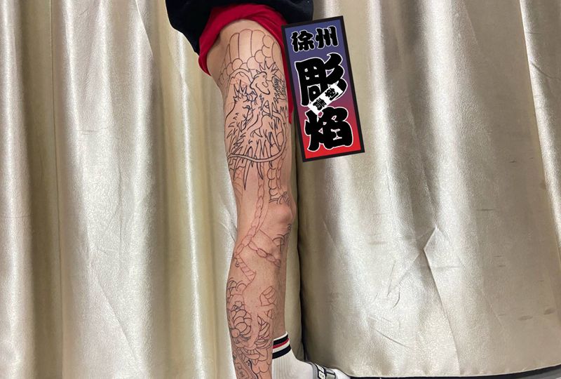 • T网红王老大花腿龙纹身图片_腿部新传统纹身图案