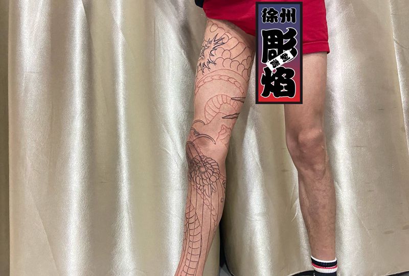 • T网红王老大花腿龙纹身图片_腿部新传统纹身图案
