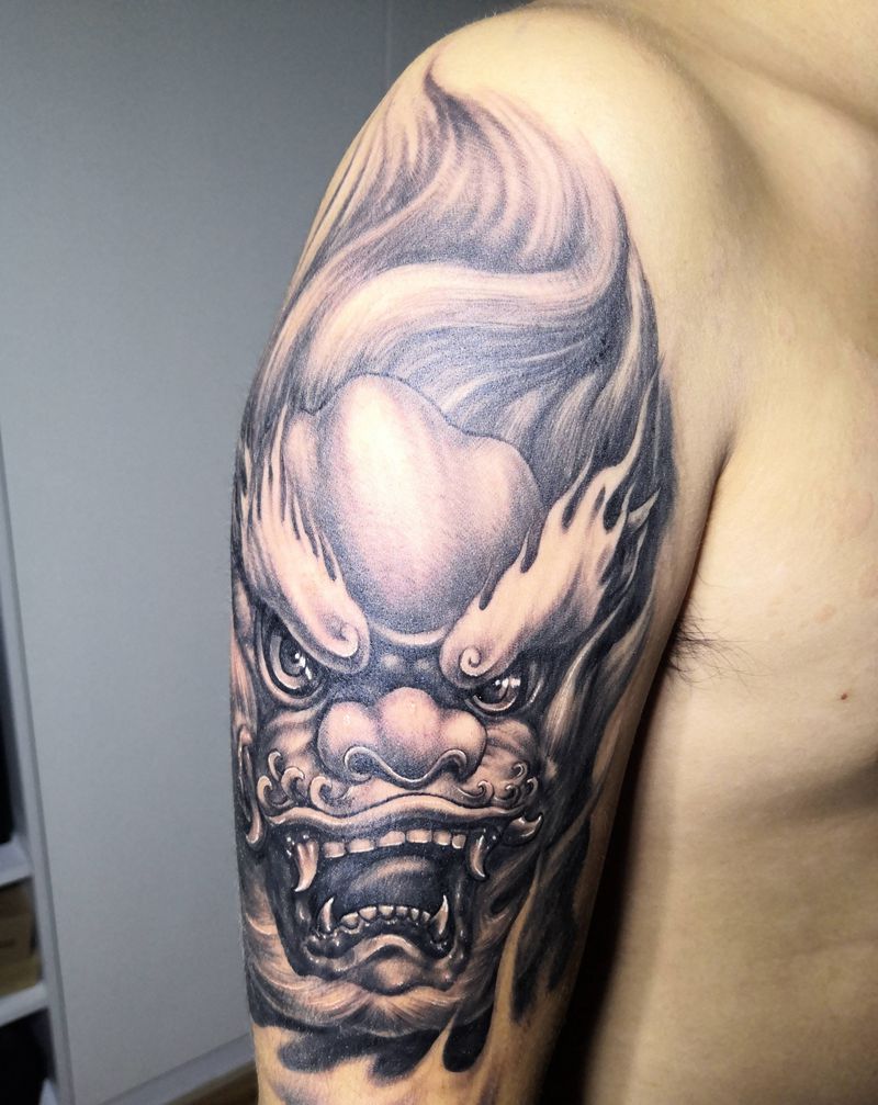 大臂唐狮纹身图片_手臂欧美写实纹身图案