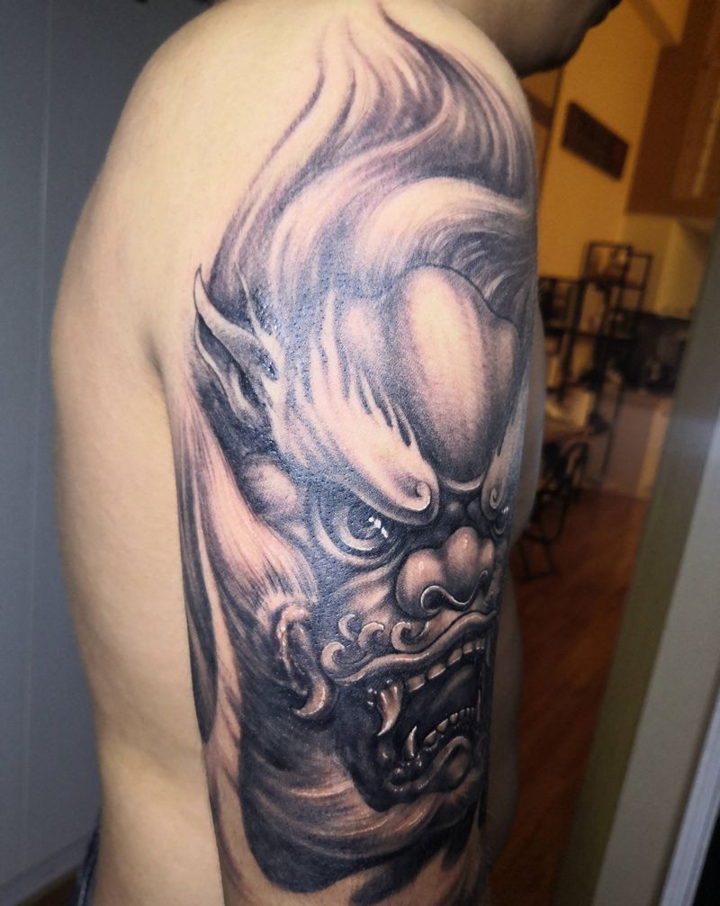当前位置: 首页 >江苏省徐州市纹身店-徐州胜杰纹身纹身图案>大臂唐狮纹身图片_手臂欧美写实纹身图案