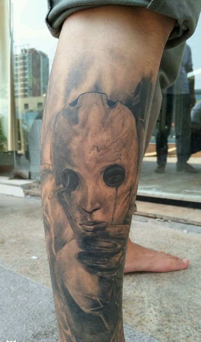 • T包小腿吹火男+阿多福纹身图片_腿部老传统新传统吹火男阿