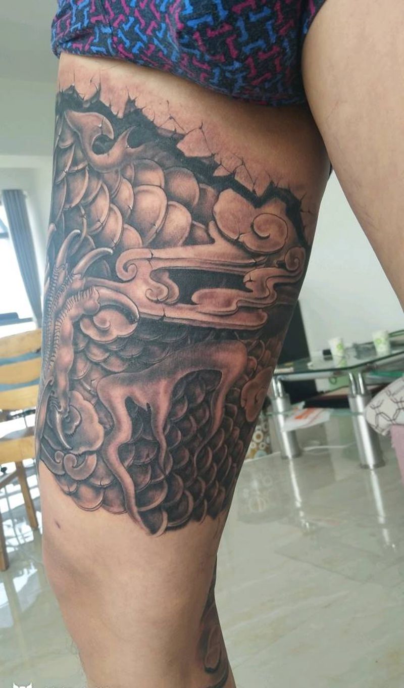• T网红王老大花腿龙纹身图片_腿部新传统纹身图案