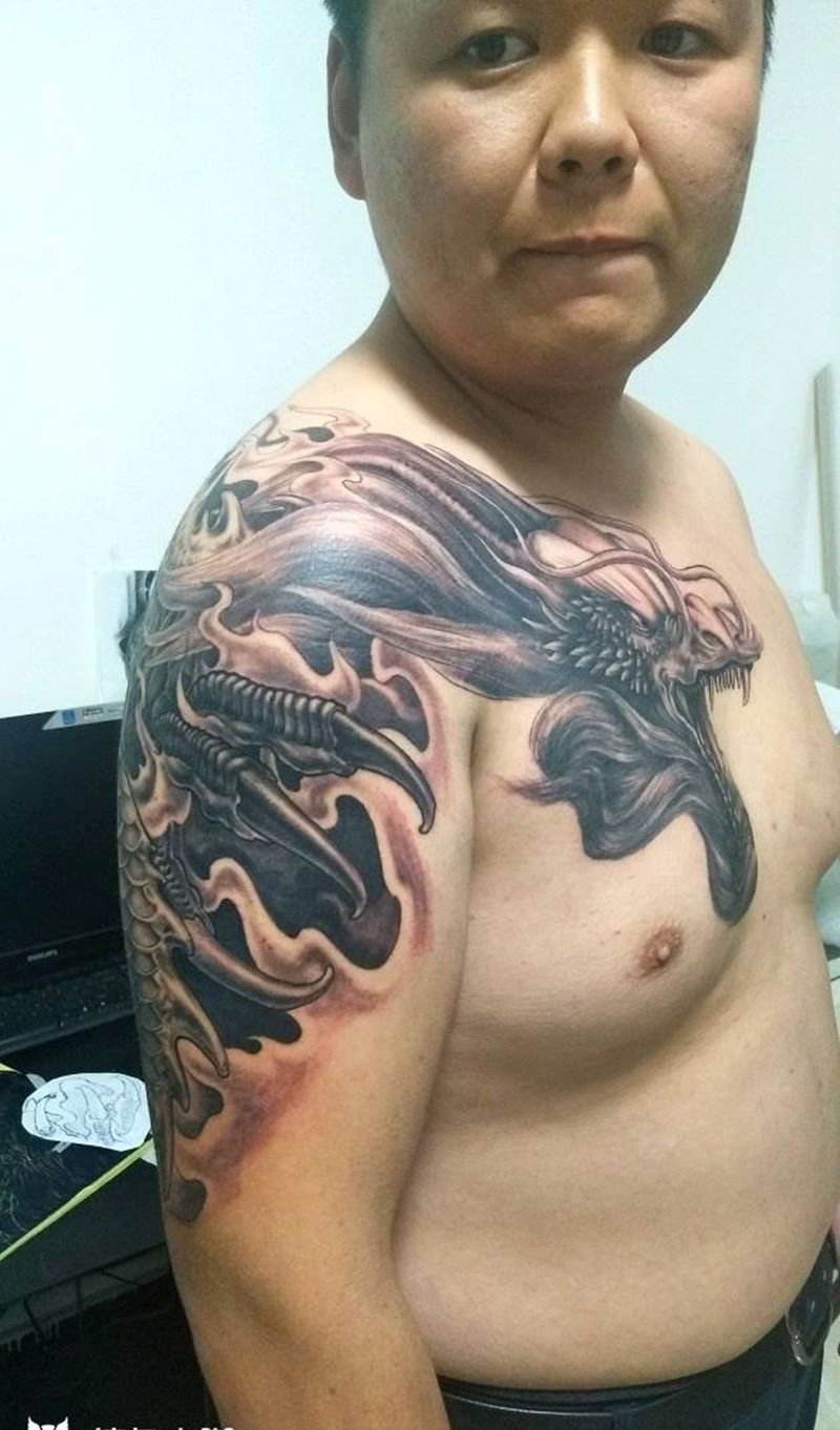 当前位置: 首页 >江苏省徐州市纹身店-徐州胜杰纹身纹身图案>双半甲龙过肩龙纹身图片_肩部胸部背部手臂纹身图案