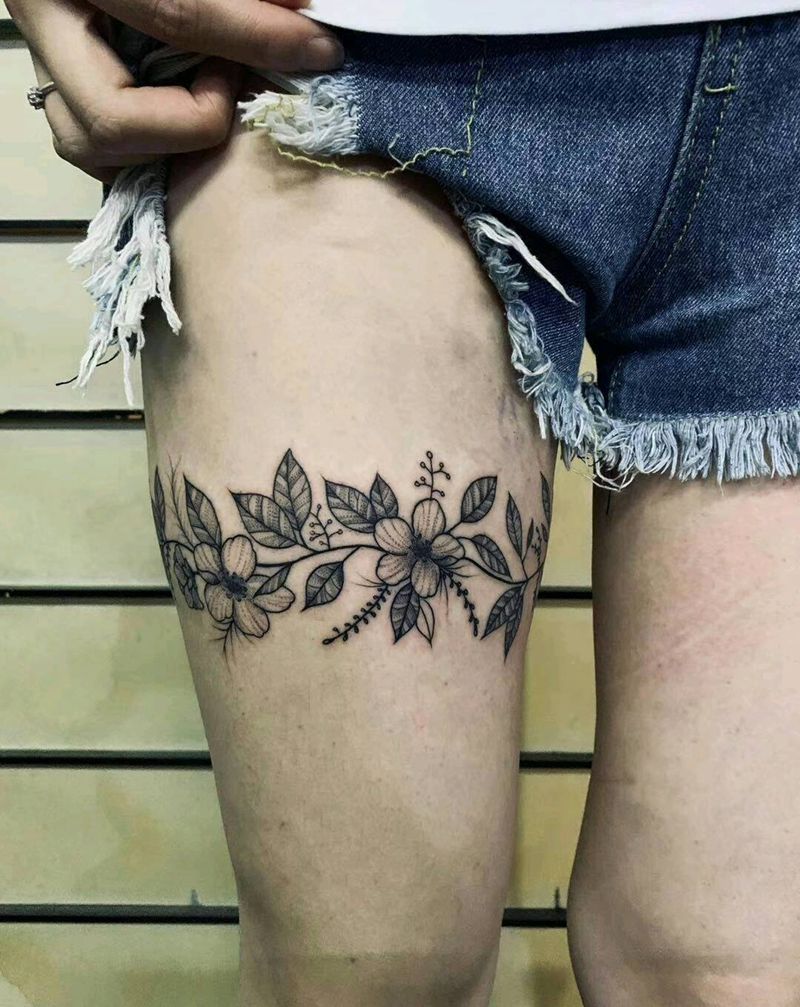 大腿素花花环纹身图片_腿部臀部点刺纹身图案