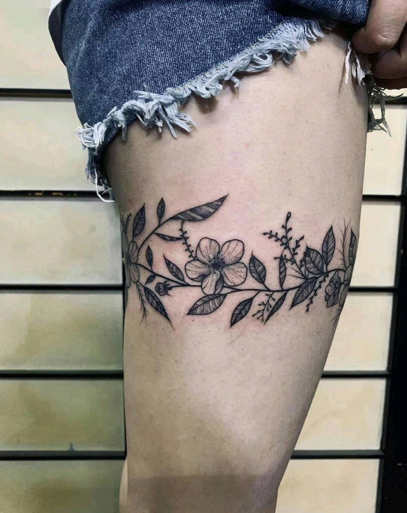 大腿素花花环纹身图片_腿部臀部点刺纹身图案
