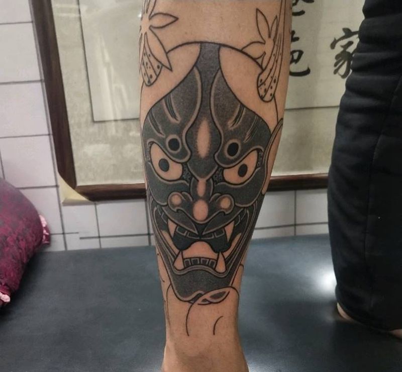 全程手绘圆三打雾般若纹身图片_脚部腿部老传统纹身图案