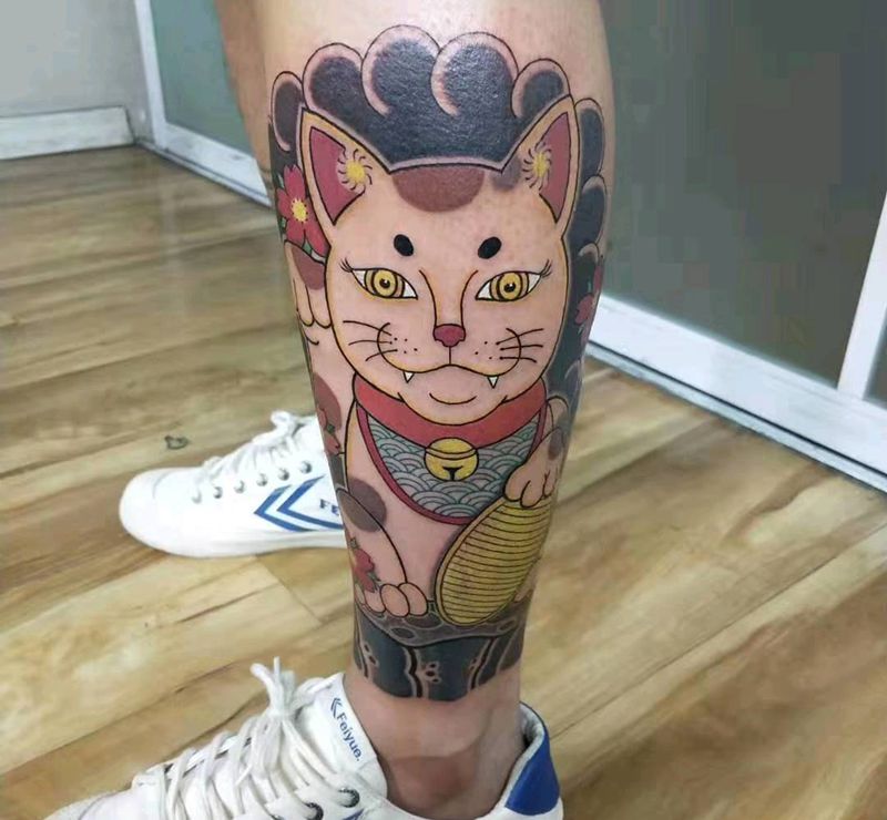 日式招财猫纹身图片_脚部腿部老传统纹身图案