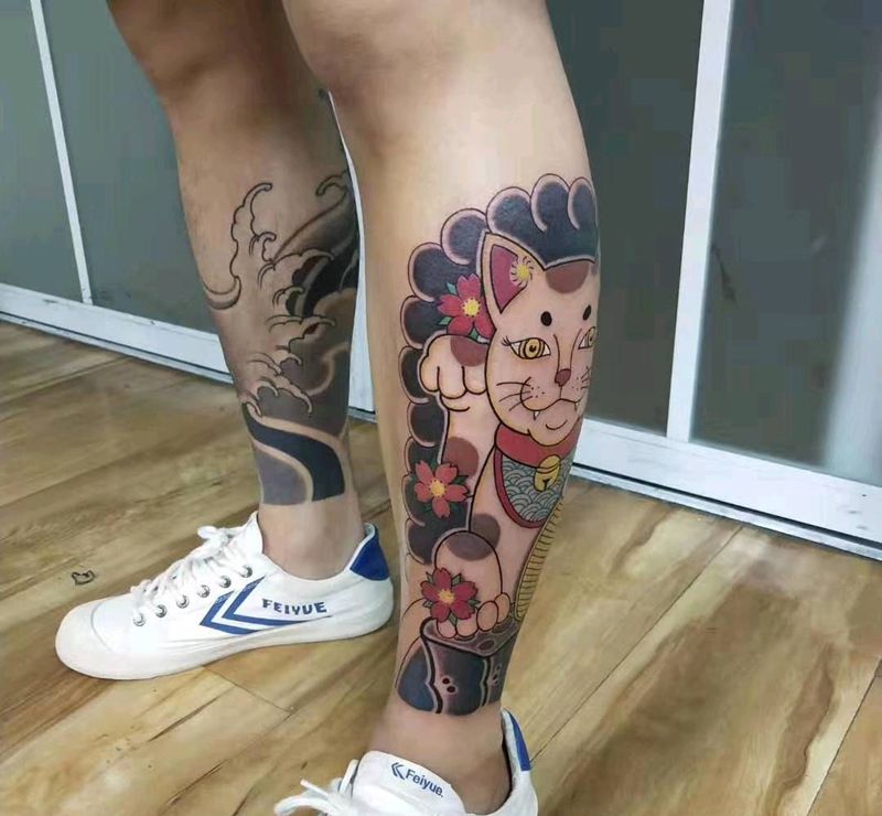 日式招财猫纹身图片_脚部腿部老传统纹身图案