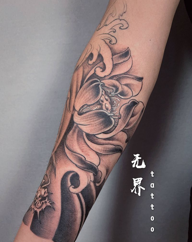鳌鱼纹身图片_手臂新传统老传统小臂龙鱼荷花纹身图案