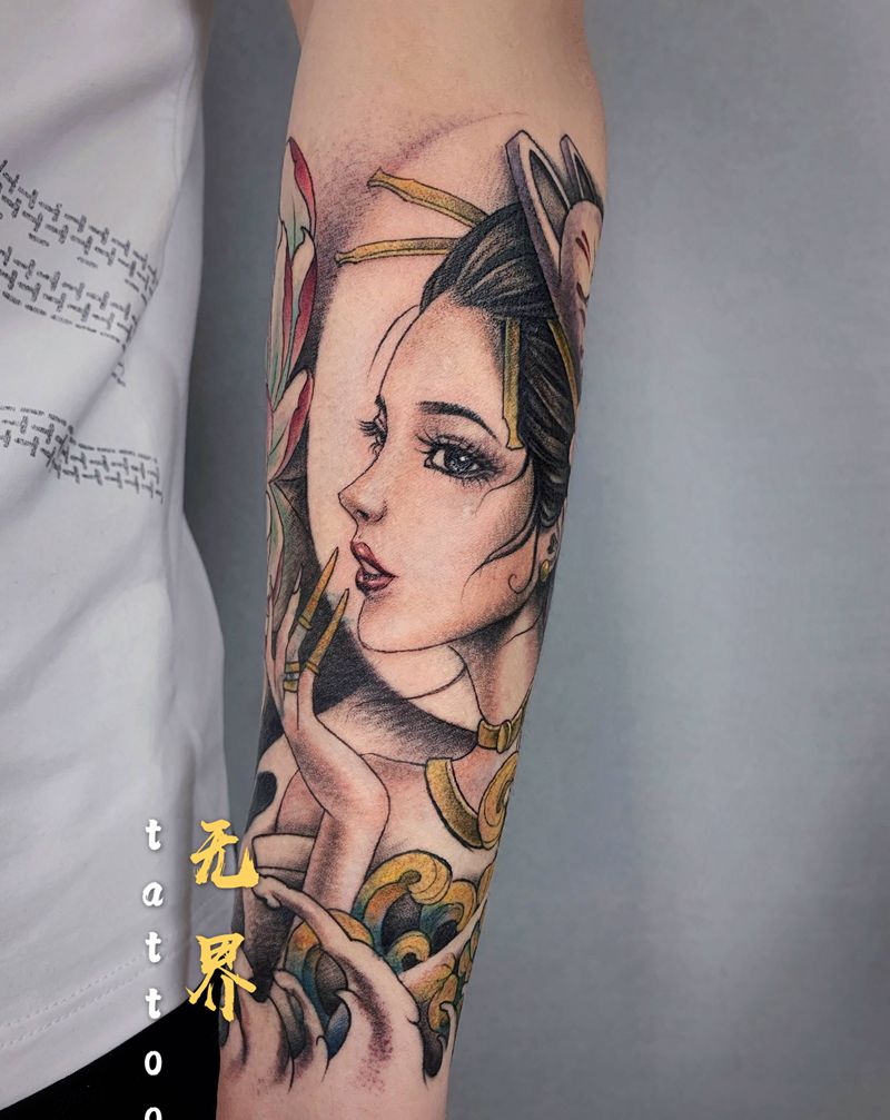 艺妓纹身图片_手臂新传统水彩美女小臂花臂纹身图案