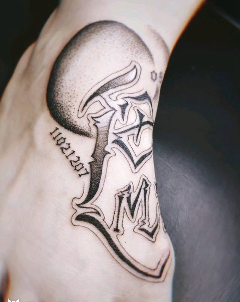 设计图纹身图片_脚部几何点刺花体英文纹身图案