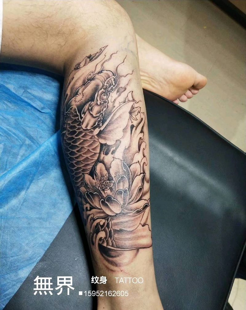 鲤鱼荷花纹身图片_腿部新传统鲤鱼荷花纹身图案
