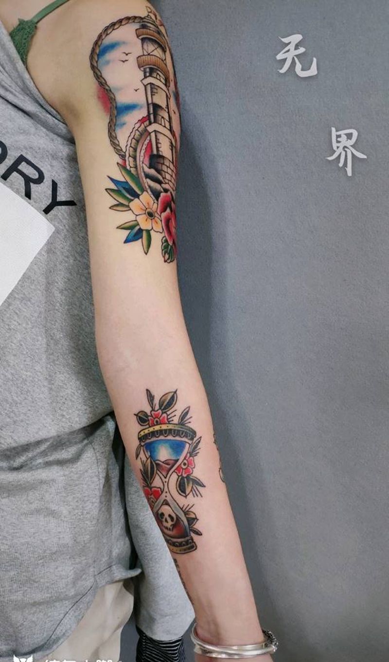 当前位置: 首页 >江苏省徐州市纹身店-徐州无界纹身纹身图案>old school纹身图片_手臂Old School花臂拼接灯塔纹身图案