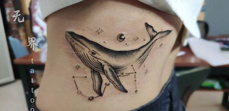 当前位置: 首页 >江苏省徐州市纹身店-徐州无界纹身纹身图案>鲸鱼纹身图片_腰部点刺鲸鱼星座纹身图案