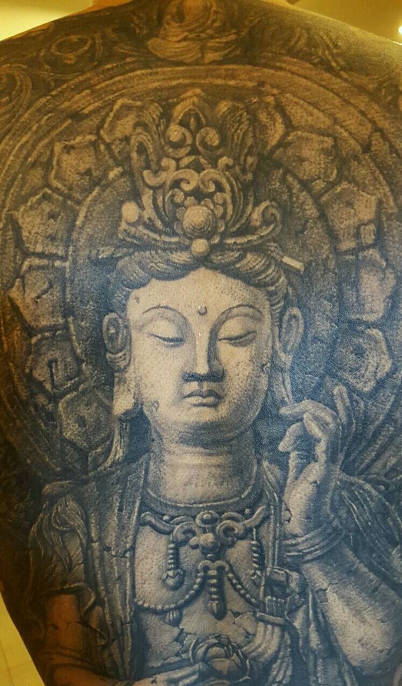 思维菩萨纹身图片_背部欧美肖像写实宗教原创石雕纹身图案