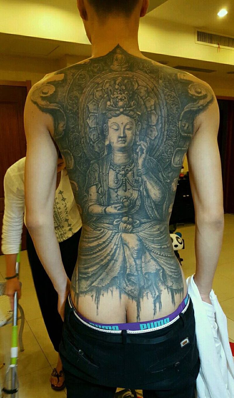 思维菩萨纹身图片_背部欧美肖像写实宗教原创石雕纹身图案