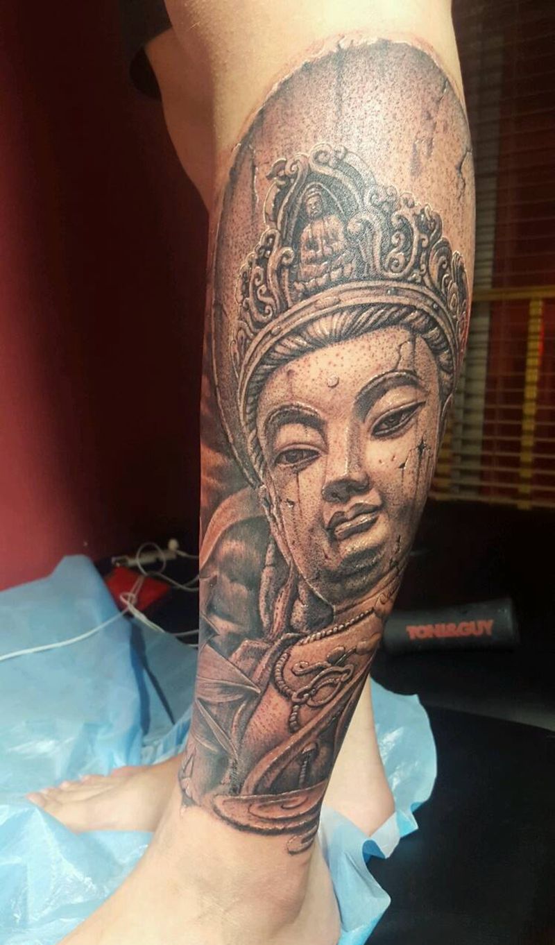 石雕佛包小腿纹身图片_腿部欧美宗教原创石雕纹身图案
