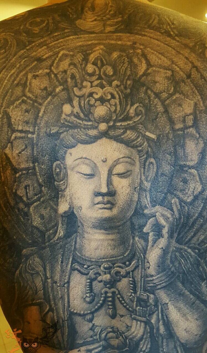 思维菩萨纹身图片_背部欧美肖像写实宗教石雕纹身图案