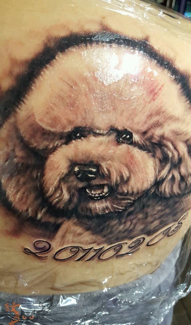 当前位置: 首页 >江苏省徐州市纹身店-晓义刺青纹身图案>泰迪肖像纹身图片_肩部欧美写实原创纹身图案