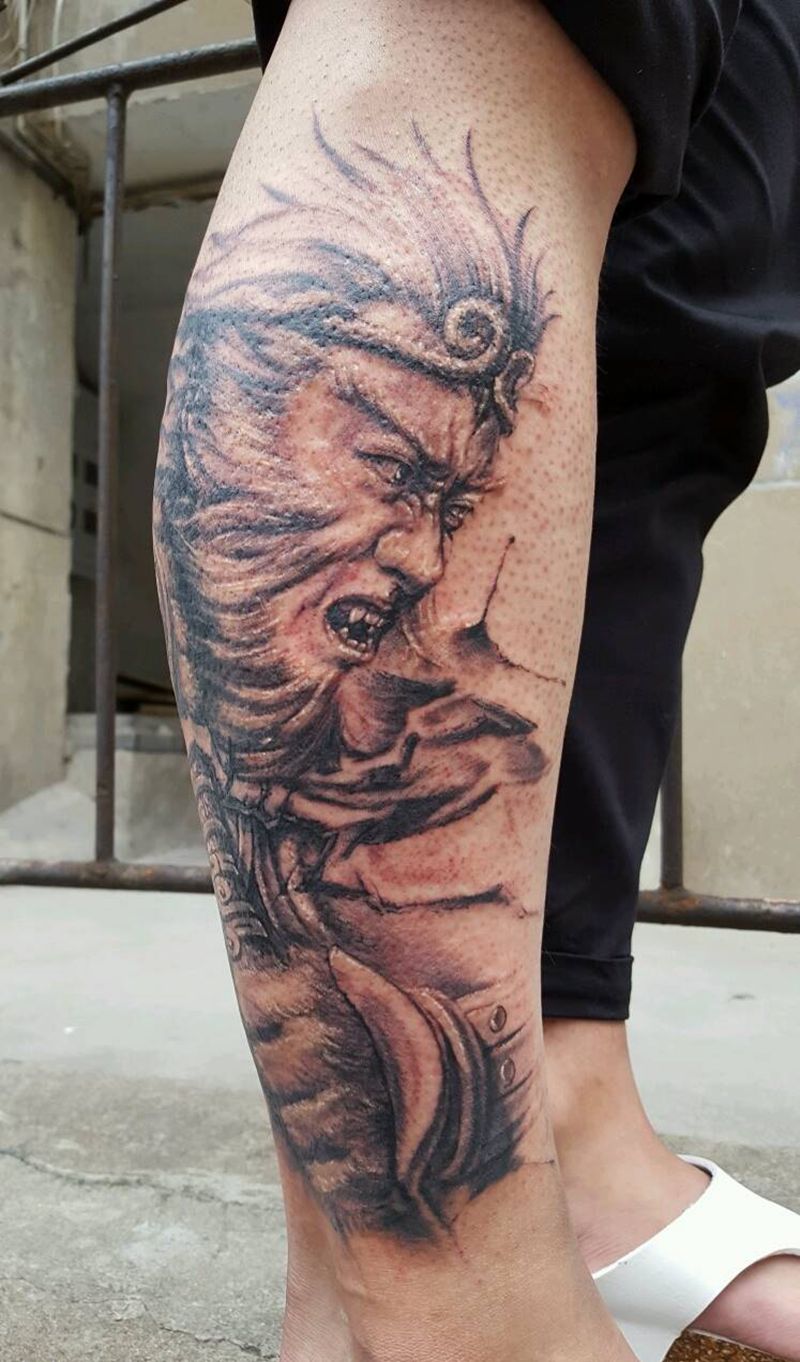 当前位置: 首页 >江苏省徐州市纹身店-晓义刺青纹身图案>怒纹身图片_腿部欧美传统肖像写实鬼神原创成品纹身图案
