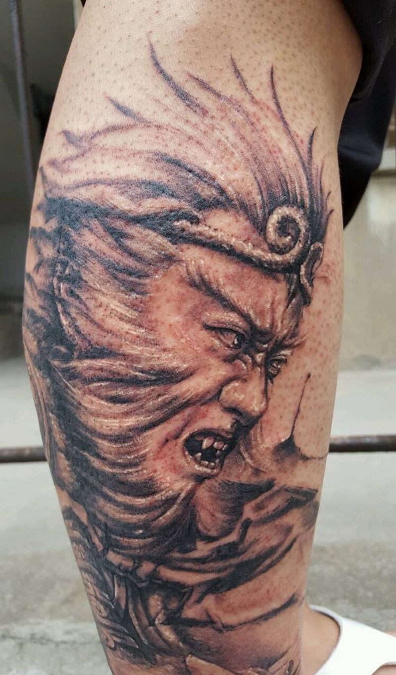 当前位置: 首页 >江苏省徐州市纹身店-晓义刺青纹身图案>怒纹身图片_腿部欧美传统肖像写实鬼神原创成品纹身图案