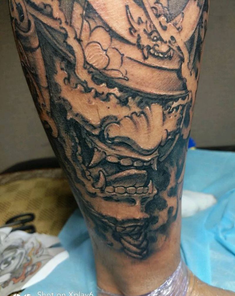 当前位置: 首页 >江苏省徐州市纹身店-晓义刺青纹身图案>鬼武士纹身图片_腿部传统人物鬼神原创成品纹身图案