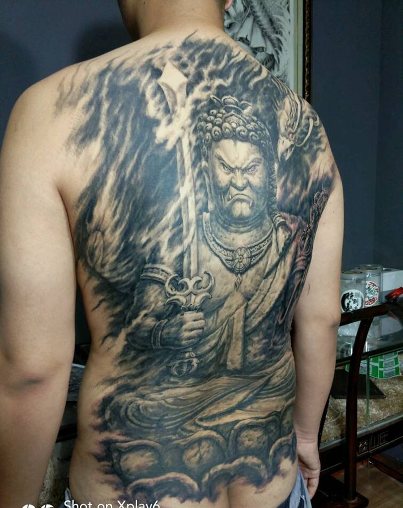 不动明王纹身图片_背部欧美传统写实宗教原创石雕成品纹身图案
