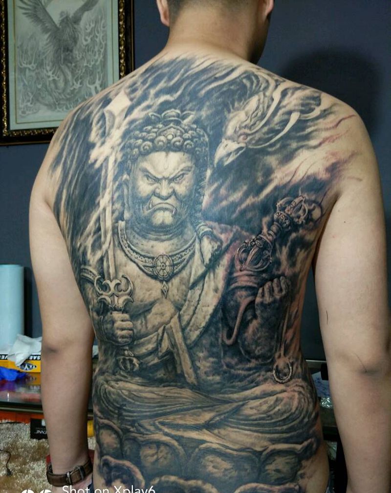 不动明王纹身图片_背部欧美传统写实宗教原创石雕成品纹身图案